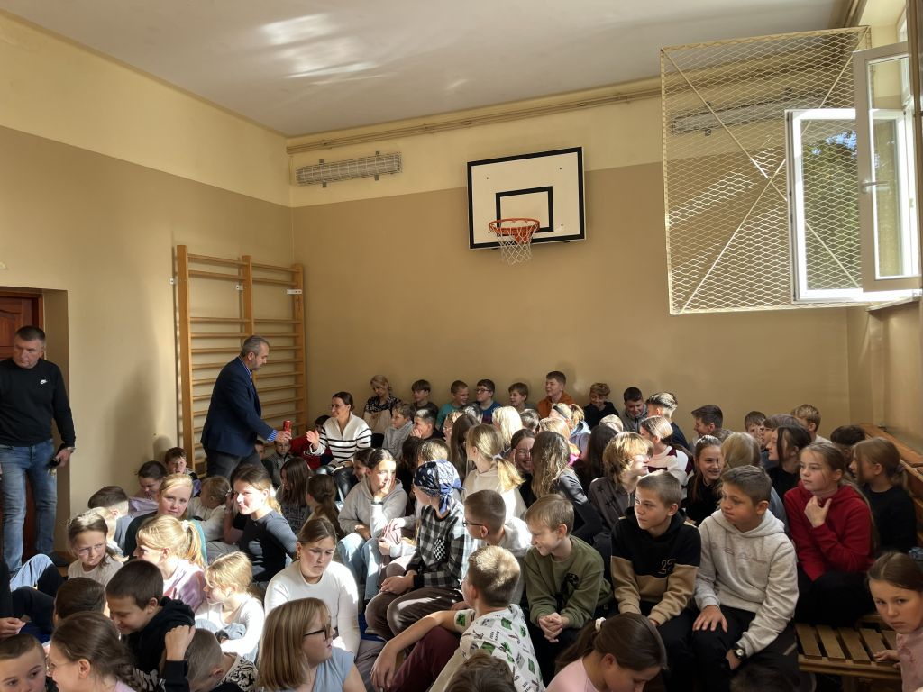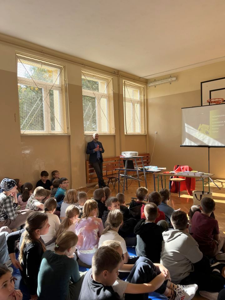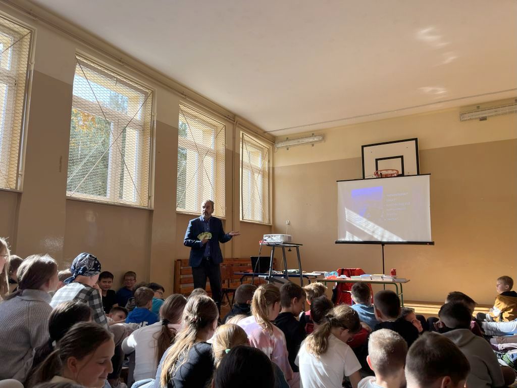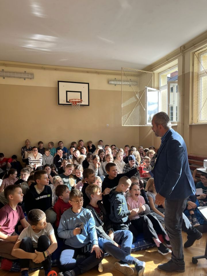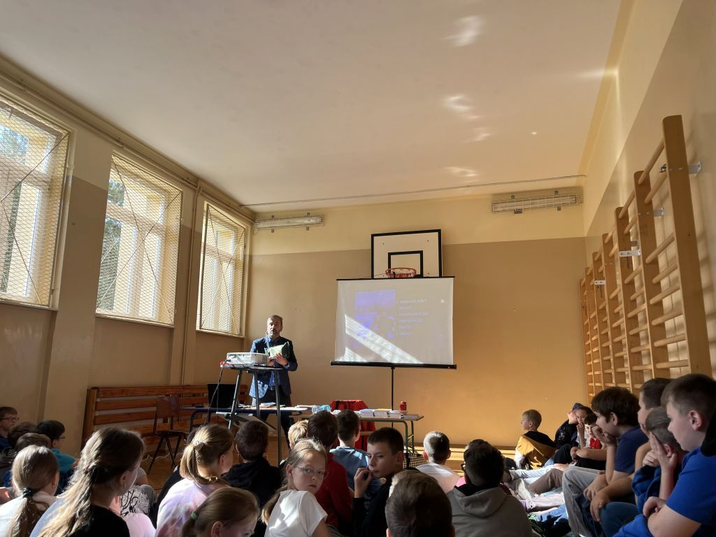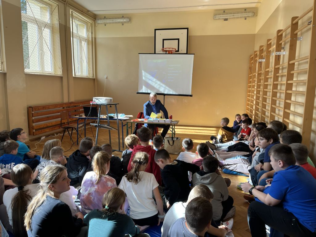 W dniu 13 października 2025 r. uczniowie klas IV – VI uczestniczyli w spotkaniu autorskim z panem Przemysławem Jakóbczykiem, pisarzem i autorem książek dla dzieci i młodzieży. Tematem prelekcji było „Jak powstaje książka – proces od A do Z”.