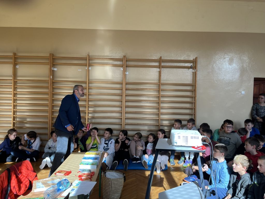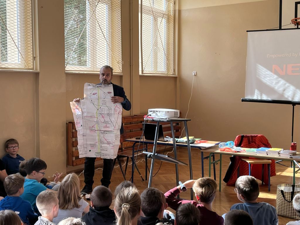 Autor w ciekawy i przystępny sposób opowiedział o swojej pracy, o tym, skąd czerpie pomysły na książki oraz jak wygląda droga od koncepcji do gotowej publikacji. Uczniowie mieli okazję zadawać pytania, a także dowiedzieć się wielu interesujących rzeczy na temat pracy pisarza i wydawnictwa.