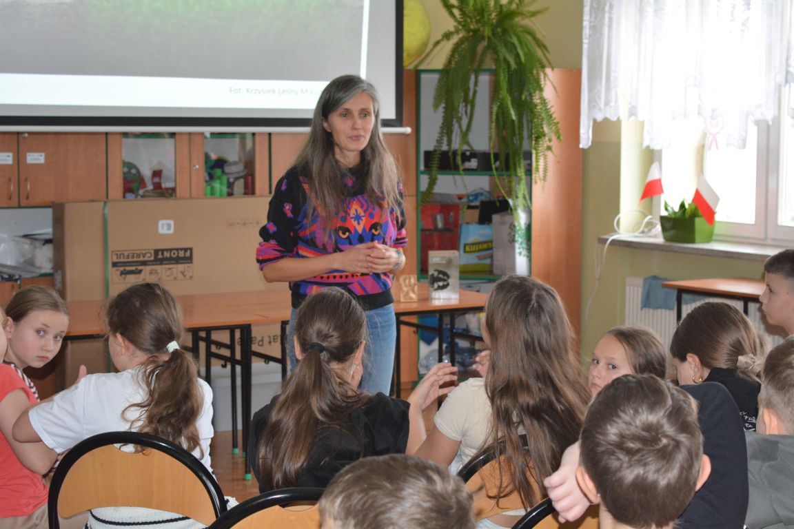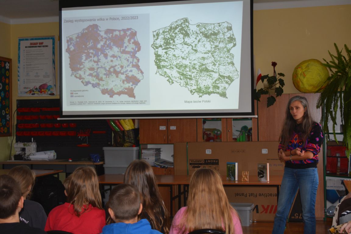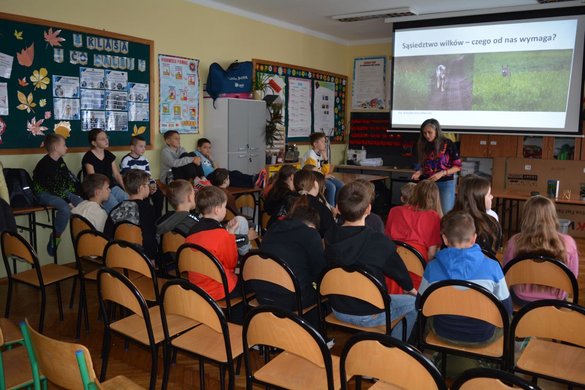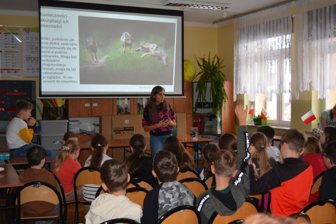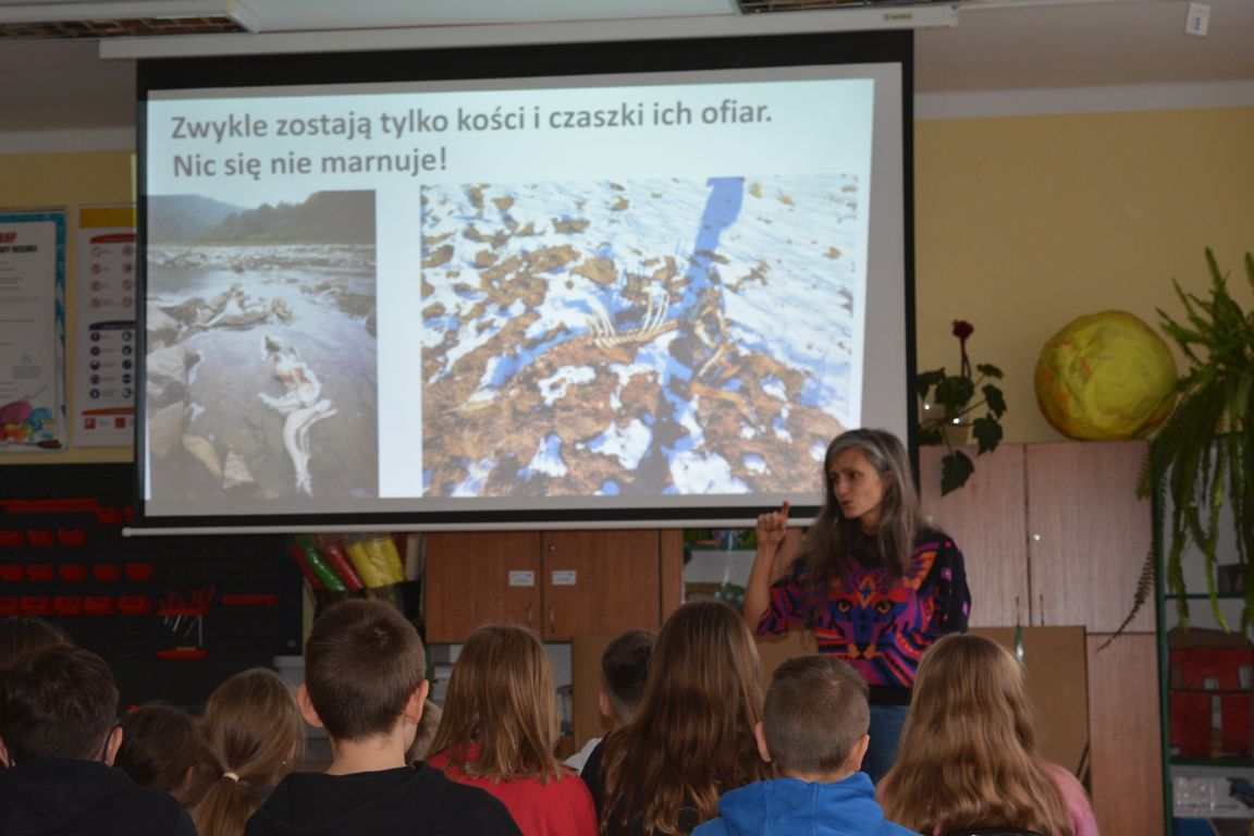 21 listopada uczniowie klas IV i VIII wzięli udział w niezwykłym spotkaniu z panią Anną Maziuk, dziennikarką i propagatorką wiedzy o przyrodzie oraz autorką książek „Instynkt. O wilkach w polskich lasach” oraz „Niedźwiedź szuka domu”. Tematem spotkania z młodzieżą były wilki. Opowiadając o życiui zwyczajach wilków pani Anny Maziuk przedstawiała obraz fascynującego zwierzęcia, bardzo rodzinnego, tworzącego silne więzi, dzikiego, ale nie złego. Odpowiadała na pytania uczniów, które nawiązywały do relacji między ludźmi a tymi dzikimi drapieżnikami. Spotkanie autorskie z Anną Maziuk było nie tylko edukacyjnym, ale i inspirującym doświadczeniem. Dzięki niej uczniowie mieli okazję pogłębić swoją wiedzę o polskich drapieżnikach i zrozumieć, jak ważna jest ich rola w ekosystemie. Była to niezapomniana okazja do spotkania z pasjonatką przyrody i miłośniczką dzikich zwierząt.