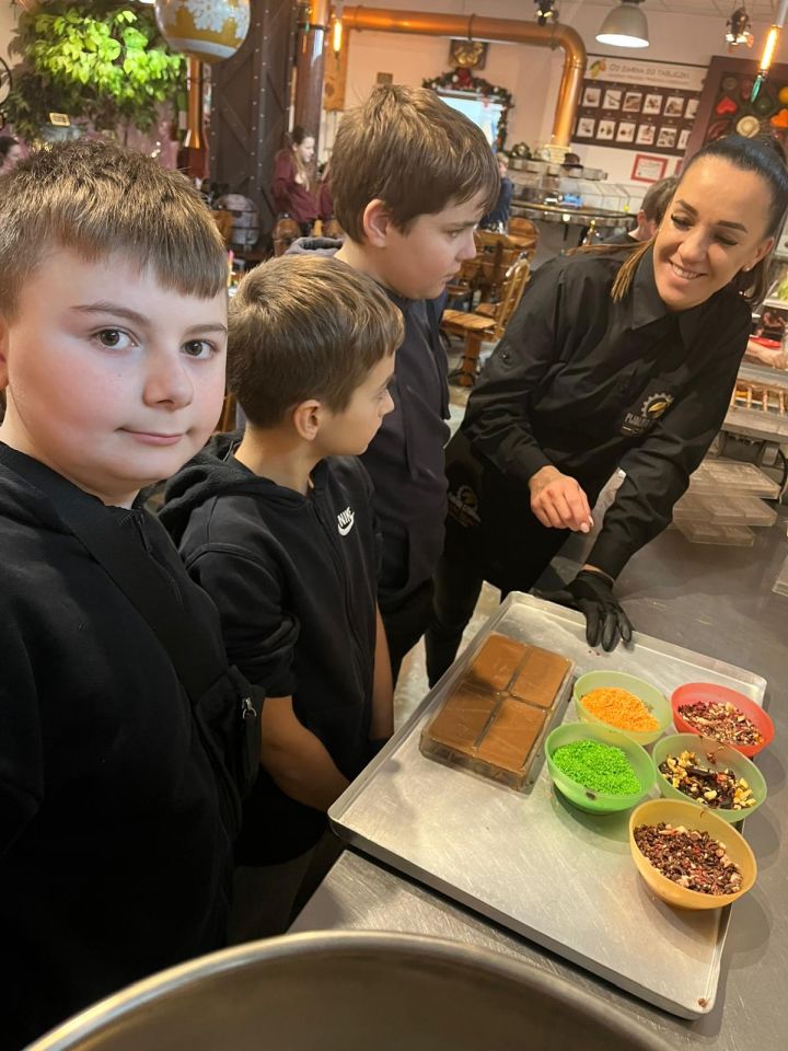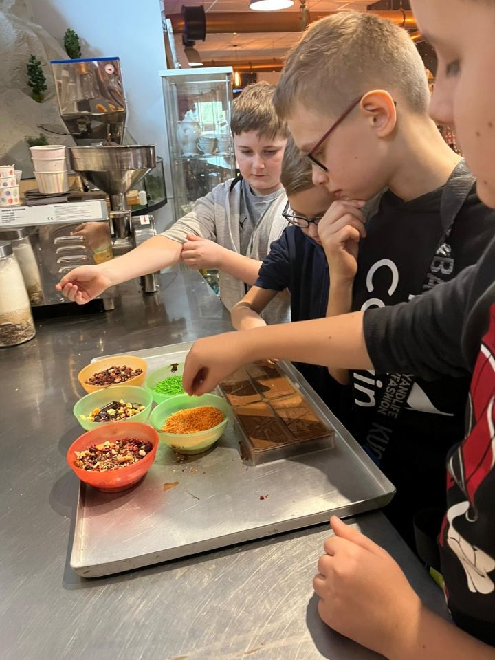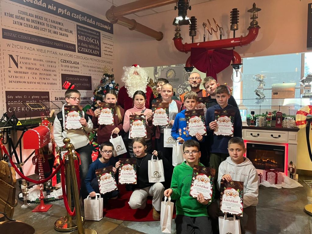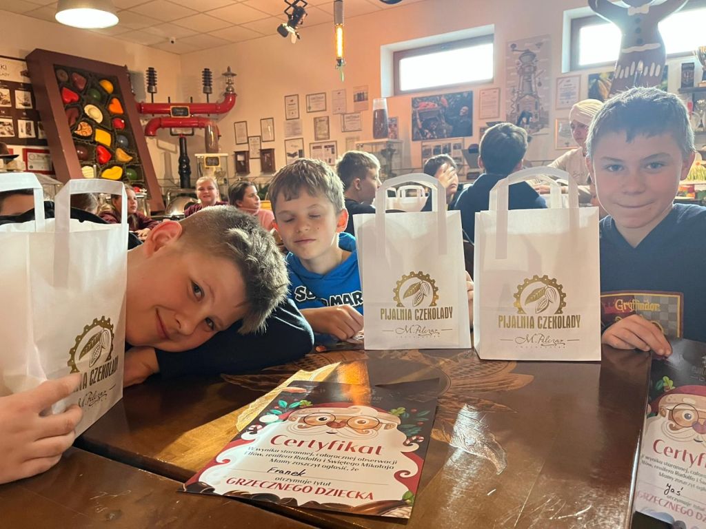 Podczas tej wyjątkowej wyprawy do fabryki czekolady, uczniowie poznali proces powstawania smakołyku oraz degustowali różne rodzaje czekolad. W sali kinowej podczas seansu filmowego zapoznali się z procesem wydobywania kabosów, poszczególnymi etapami tworzenia czekolady, od ziarenka kakaowca aż po dotarcie produktu na półki sklepowe. Dzieci brały udział w warsztatach tworzenia tego słodkiego przysmaku oraz ozdabiali pierniczki. Nie zabrakło również spotkania z Mikołajem oraz prezentów, niespodzianek i konkursów.