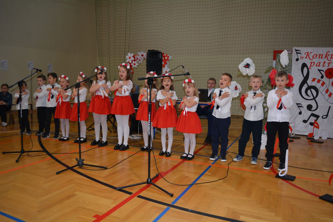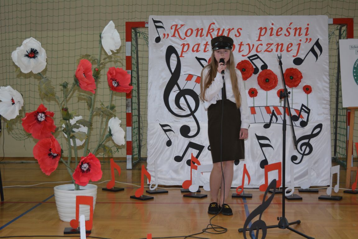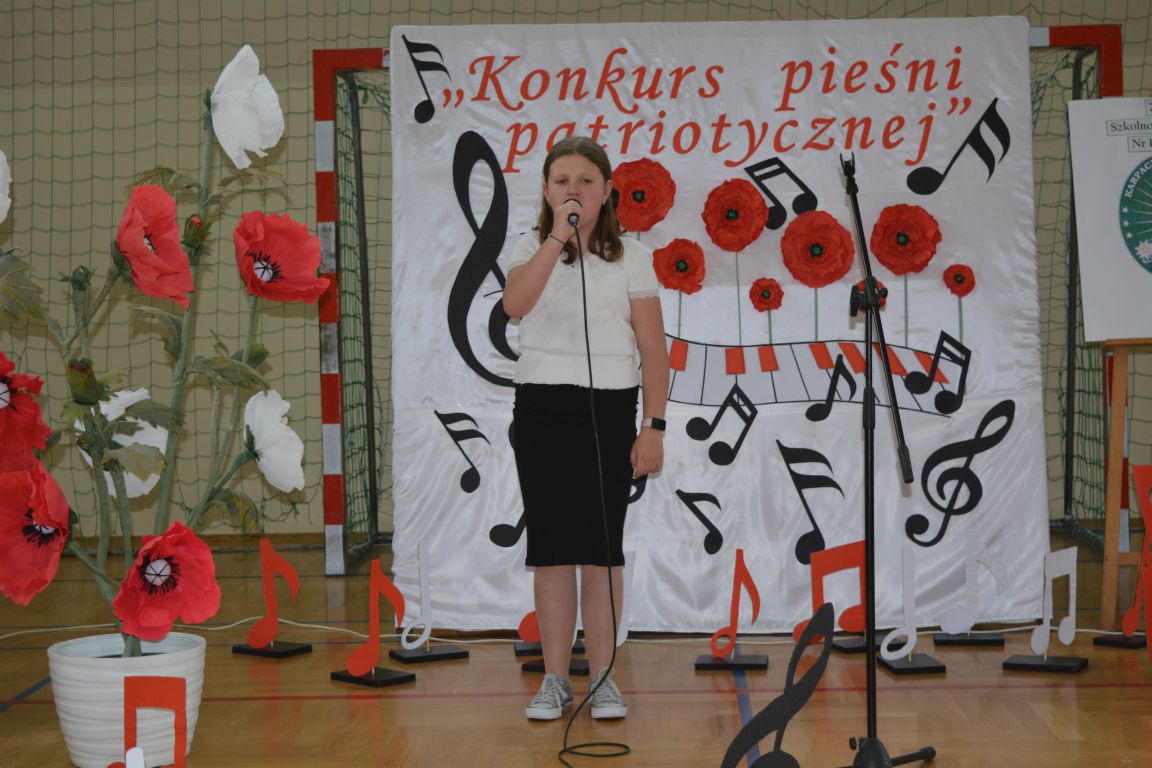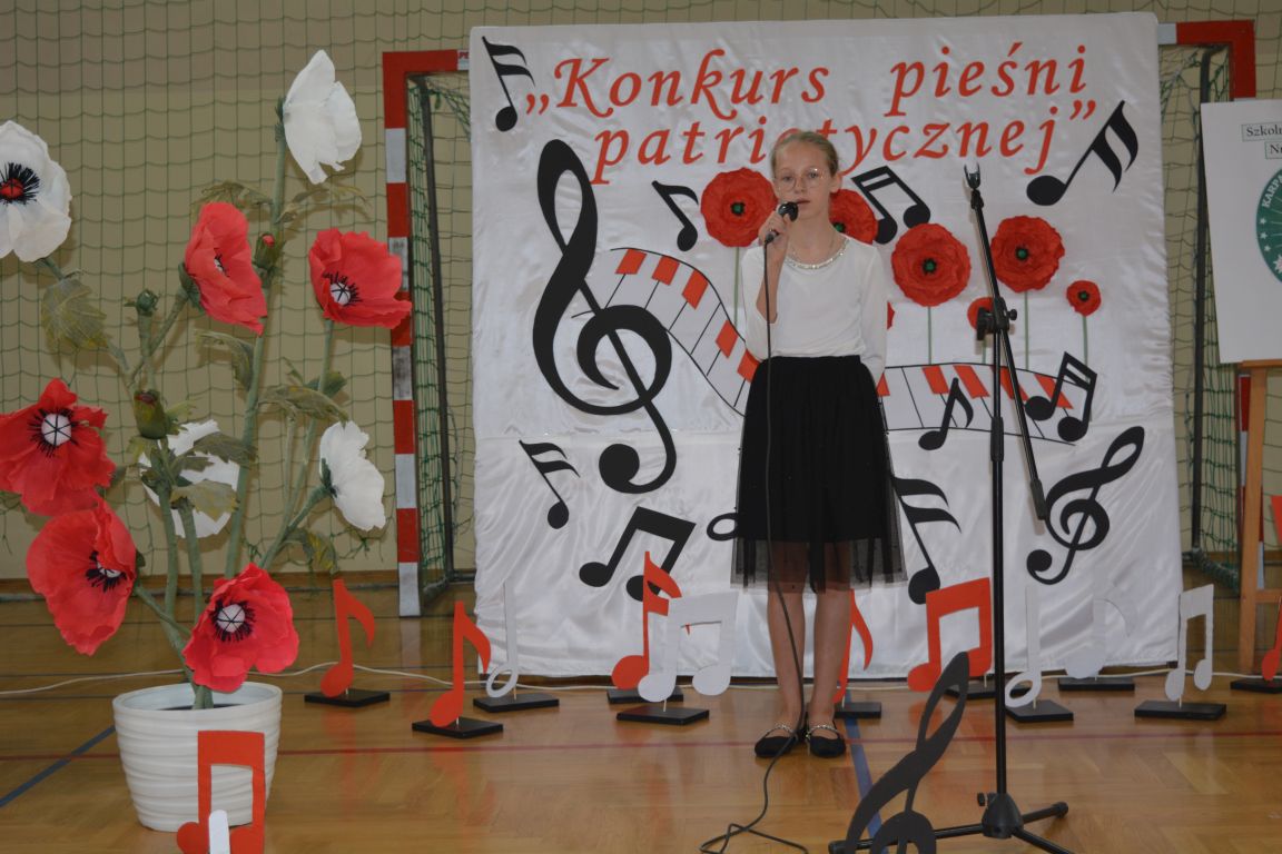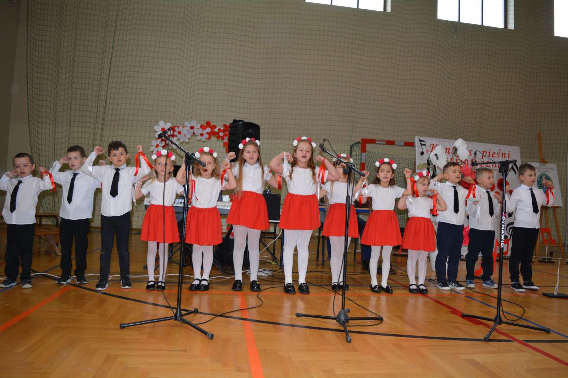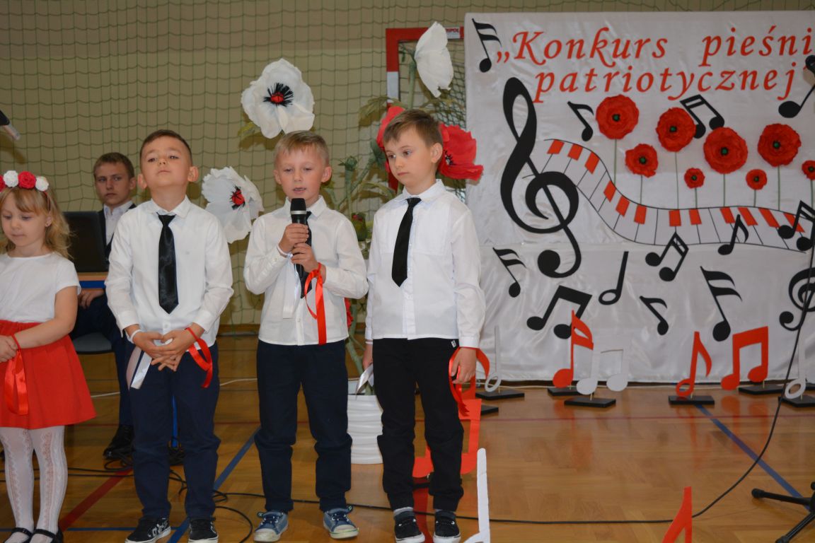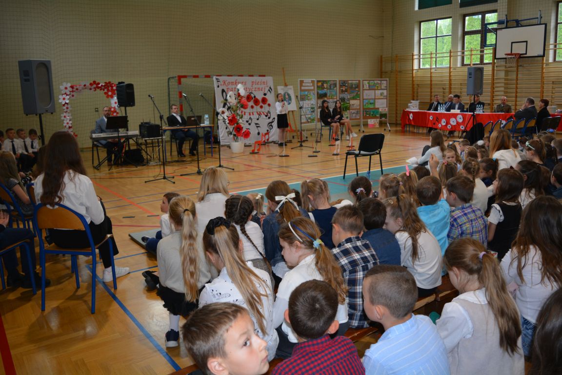 Kolejnym punktem obchodów „Dnia Patrona” był „Konkurs pieśni patriotycznej”. Do udziału w zmaganiach konkursowych zgłosiło się aż 21 uczniów z klas I -VII. Naszych gości zaprosiliśmy do komisji oceniającej występy młodych artystów. Warto pamiętać, że dla nowych pokoleń pieśni patriotyczne są nośnikiem pamięci historycznej, ucząc młodych ludzi o bohaterach narodowych, ważnych wydarzeniach historycznych i ideałach, za które walczyli nasi przodkowie. Rodzice i nauczyciele z dumą obserwowali, jak ich pociechy i wychowankowie prezentowali swoje umiejętności wokalne, a po każdym występie rozbrzmiewają gromkie brawa. Występy te były prawdziwym świętem, które na długo pozostaje w pamięci zarówno dzieci, jak i ich bliskich.