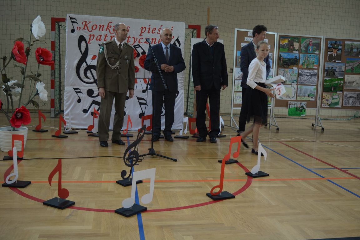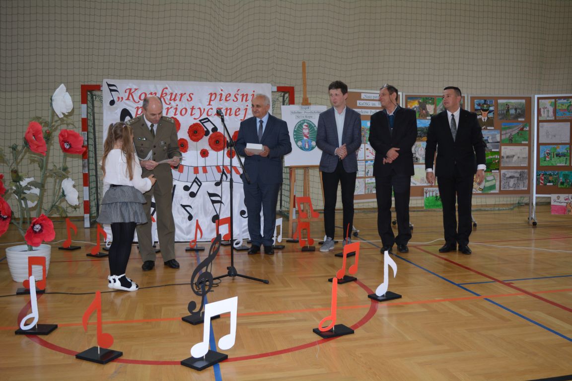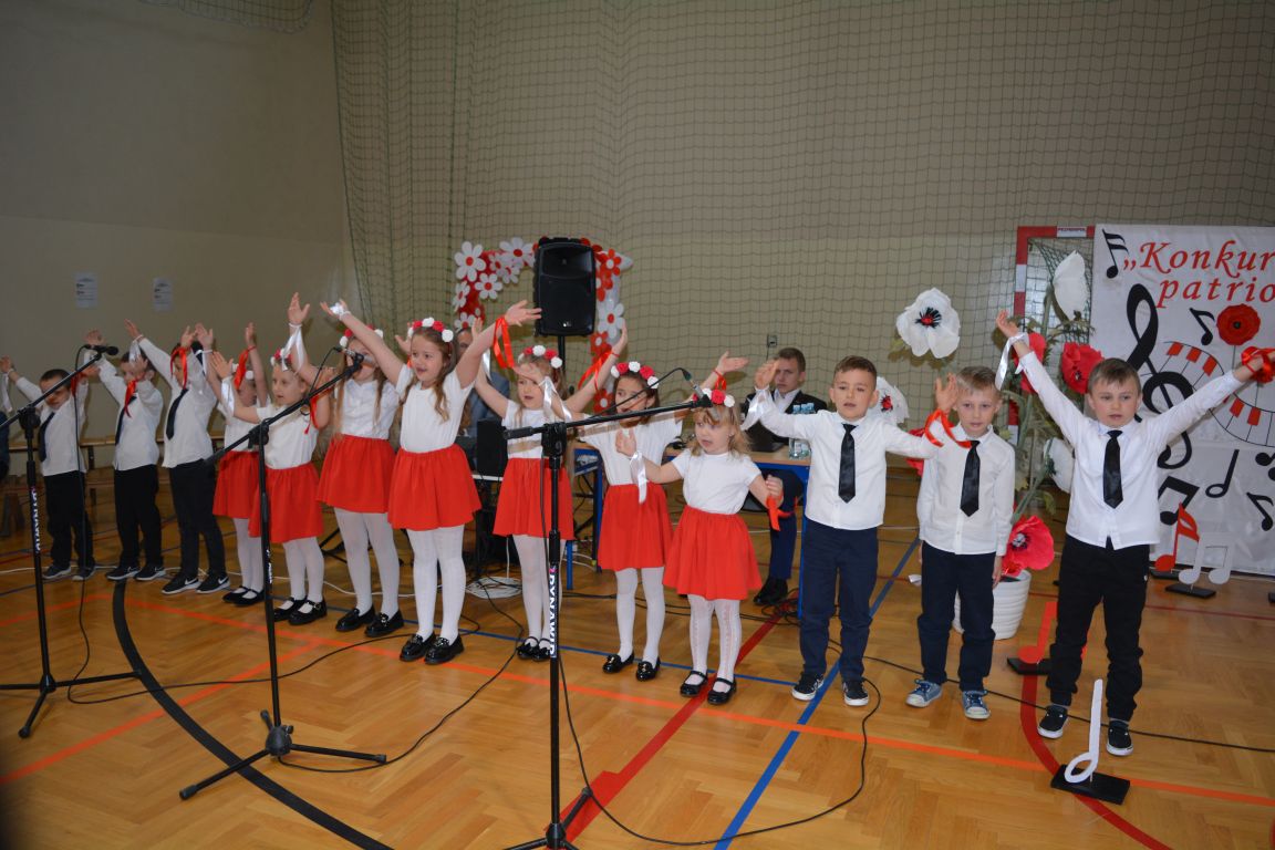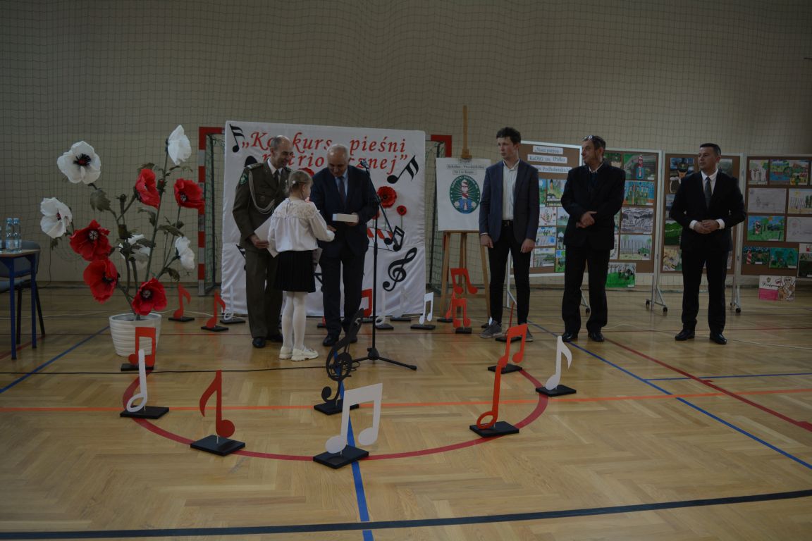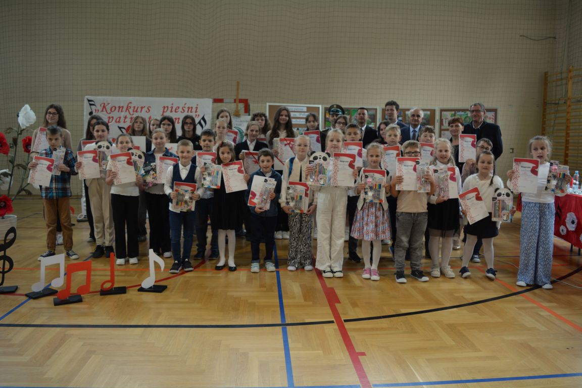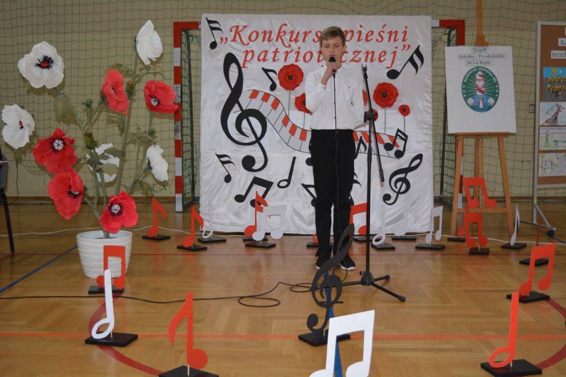 Kolejnym punktem obchodów „Dnia Patrona” był „Konkurs pieśni patriotycznej”. Do udziału w zmaganiach konkursowych zgłosiło się aż 21 uczniów z klas I -VII. Naszych gości zaprosiliśmy do komisji oceniającej występy młodych artystów. Warto pamiętać, że dla nowych pokoleń pieśni patriotyczne są nośnikiem pamięci historycznej, ucząc młodych ludzi o bohaterach narodowych, ważnych wydarzeniach historycznych i ideałach, za które walczyli nasi przodkowie. Rodzice i nauczyciele z dumą obserwowali, jak ich pociechy i wychowankowie prezentowali swoje umiejętności wokalne, a po każdym występie rozbrzmiewają gromkie brawa. Występy te były prawdziwym świętem, które na długo pozostaje w pamięci zarówno dzieci, jak i ich bliskich.