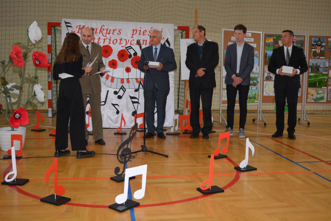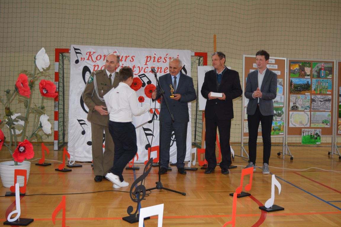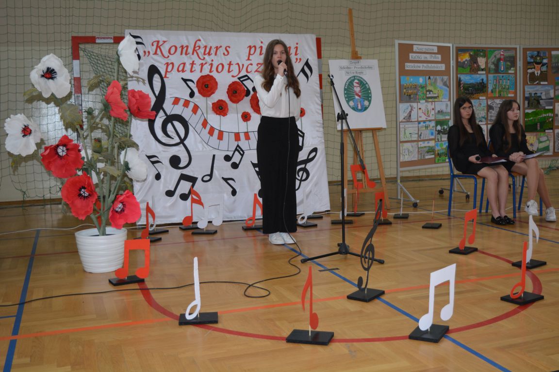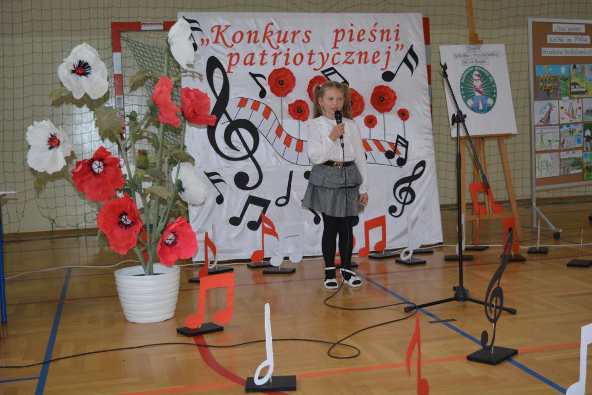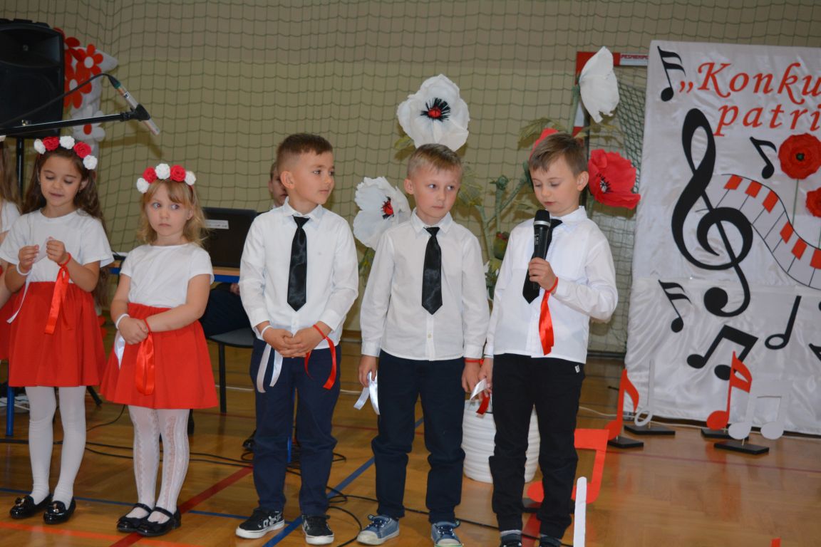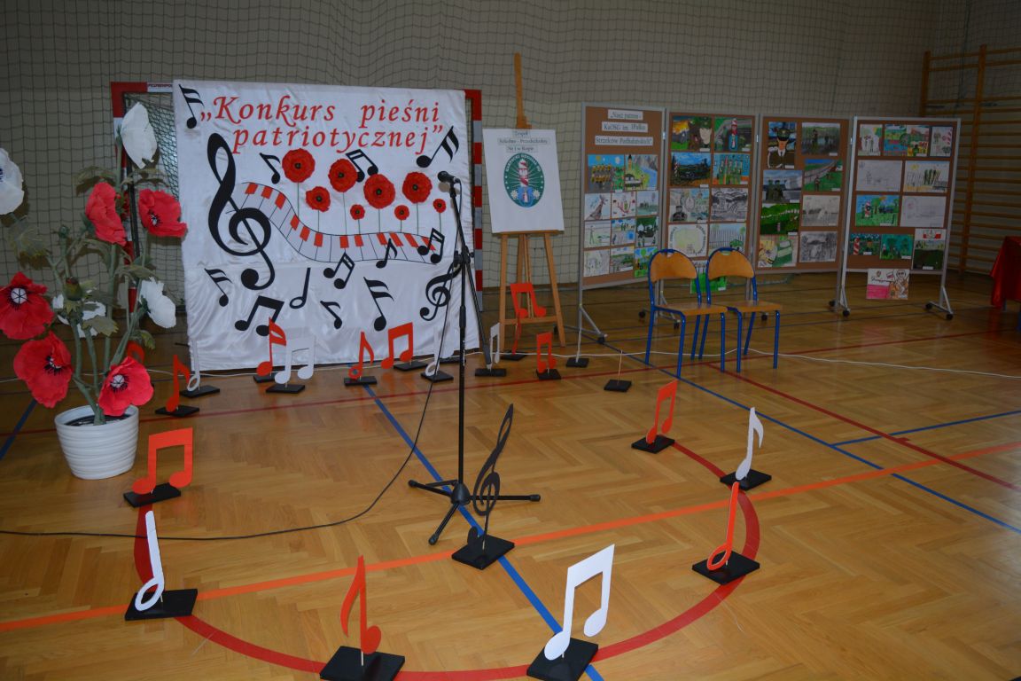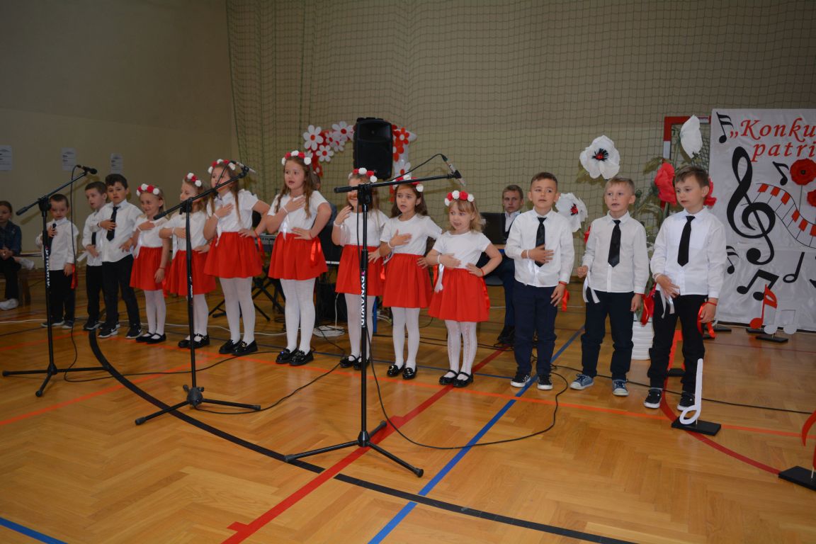 Kolejnym punktem obchodów „Dnia Patrona” był „Konkurs pieśni patriotycznej”. Do udziału w zmaganiach konkursowych zgłosiło się aż 21 uczniów z klas I -VII. Naszych gości zaprosiliśmy do komisji oceniającej występy młodych artystów. Warto pamiętać, że dla nowych pokoleń pieśni patriotyczne są nośnikiem pamięci historycznej, ucząc młodych ludzi o bohaterach narodowych, ważnych wydarzeniach historycznych i ideałach, za które walczyli nasi przodkowie. Rodzice i nauczyciele z dumą obserwowali, jak ich pociechy i wychowankowie prezentowali swoje umiejętności wokalne, a po każdym występie rozbrzmiewają gromkie brawa. Występy te były prawdziwym świętem, które na długo pozostaje w pamięci zarówno dzieci, jak i ich bliskich.