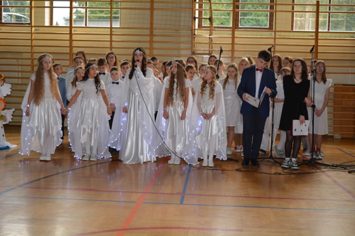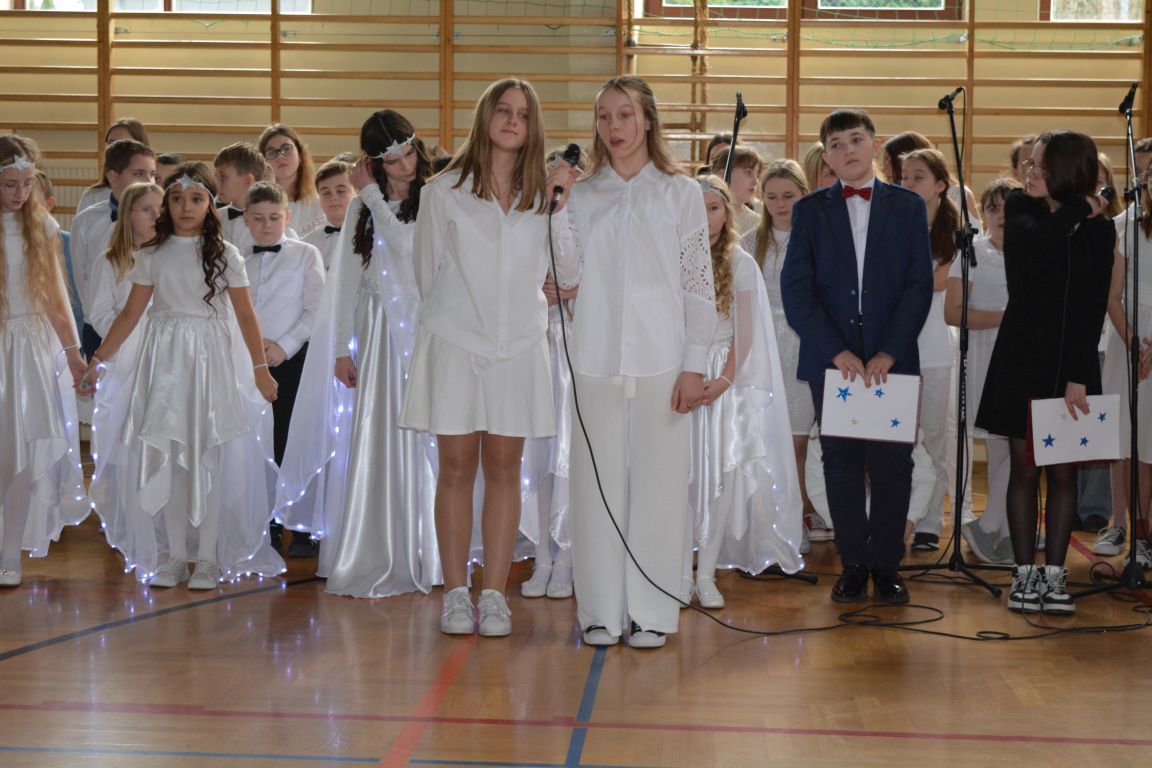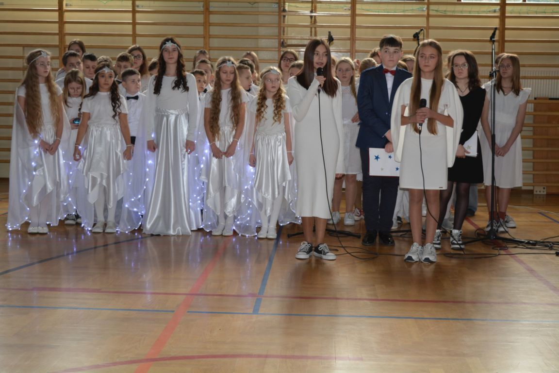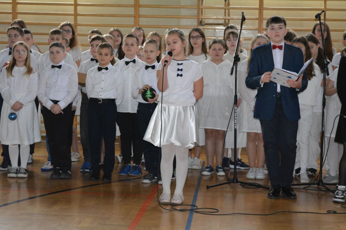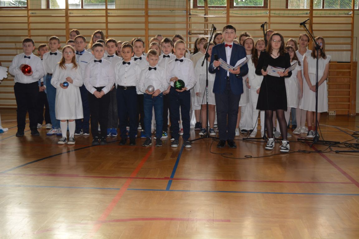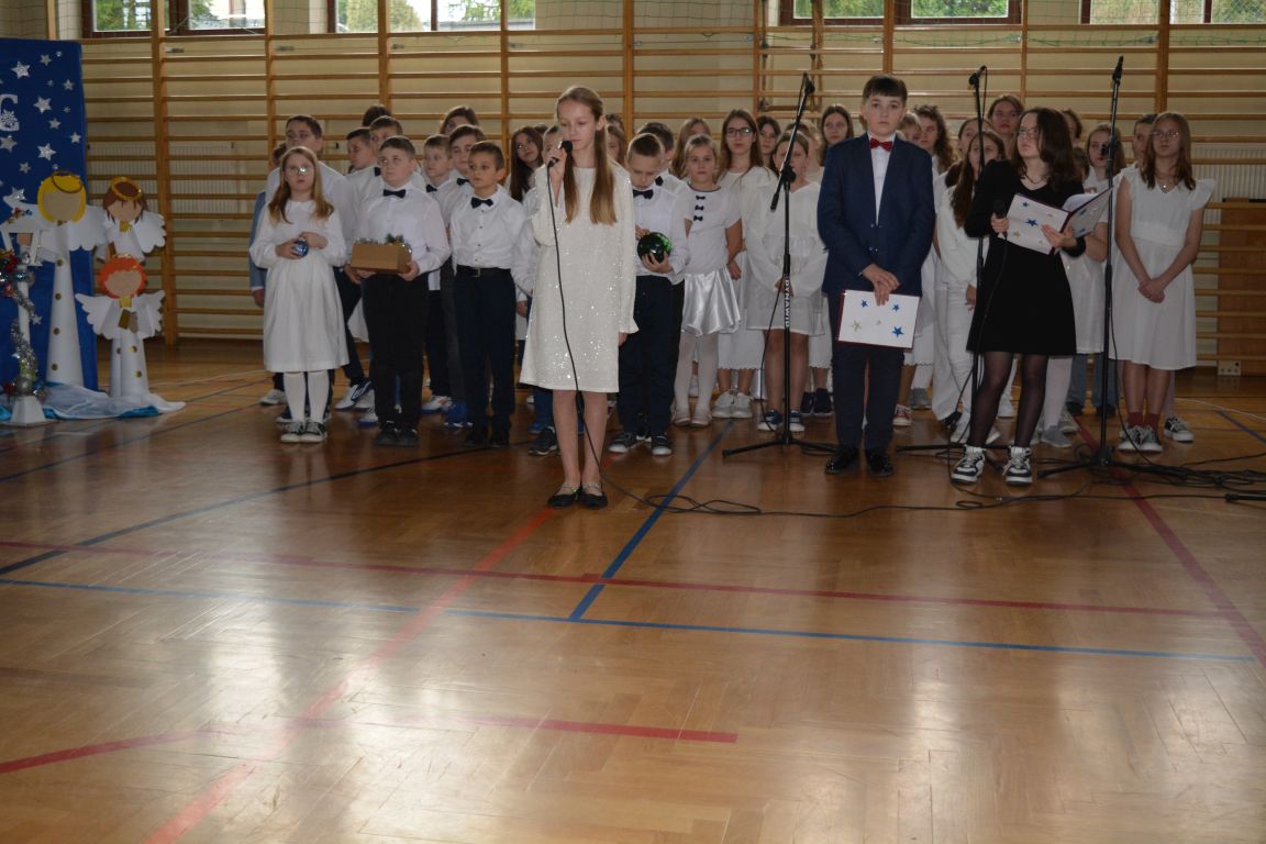 Czas Bożego Narodzenia to okres szczególny, czas magiczny. Obdarzamy się wzajemną życzliwością, łamiemy się opłatkiem, składamy życzenia. W tym czasie zapominamy o wszystkich sporach, a poddajemy się magii świąt, o czym w uroczystym, świątecznym  przedstawieniu  przypomnieli nam uczniowie klasy 4a i 6b oraz chór szkolny „Amadeus”. W  patorałkowych rytmach, w tańcu aniołów oraz w przekazanym słowie ukazali to, co w świętach jest najważniejsze. W uroczystości uczestniczyli rodzice, nauczyciele, emeryci, pracownicy administracyjni oraz zaproszeni goście w osobach pana Wójta Karola Górskiego, przewodniczącego Rady Gminy Bogdana Łukaszyka, skarbnika gminy pani Renaty Lisowicz oraz dyrektor CUO pani Anny Łukaszyk. Program artystyczny został przygotowany przez panią Dorotę Wierzchanowską oraz Monikę Pękalę. Dekoracje przygotowały: pani Lucyna Woch, Barbara Malisz oraz Sylwia Wrońska, a o oprawę muzyczną zadbał pan Mirosław Kawa. Przedstawienie dostarczyło wszystkim uczestnikom wielu wrażeń i wprowadziło w niezwykłą atmosferę świąt. Wszystkim uczniom, rodzicom, nauczycielom oraz pracownikom szkoły składamy najserdeczniejsze życzenia. Wesołych Świąt Bożego Narodzenia oraz szczęśliwego Nowego Roku 2025!