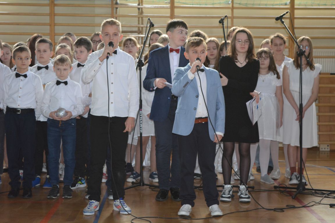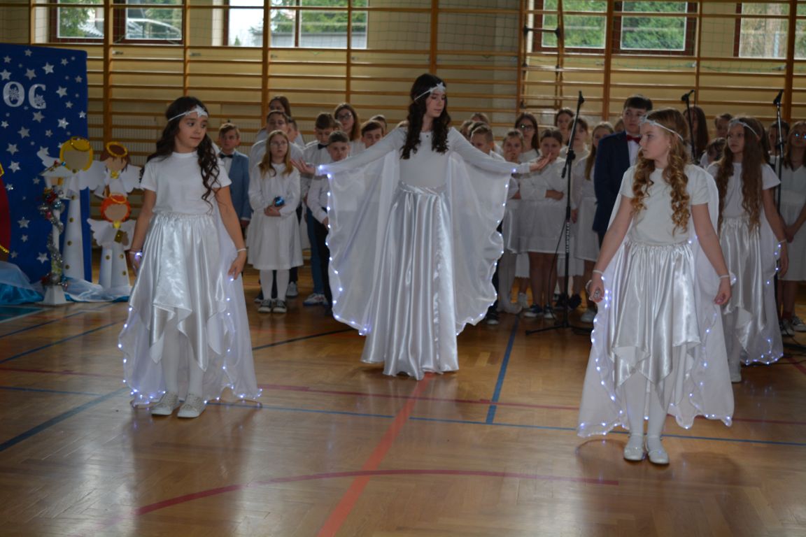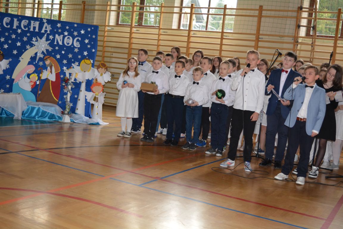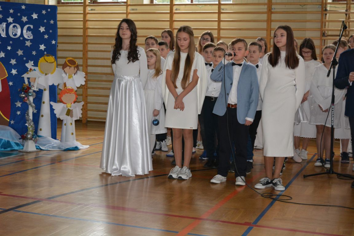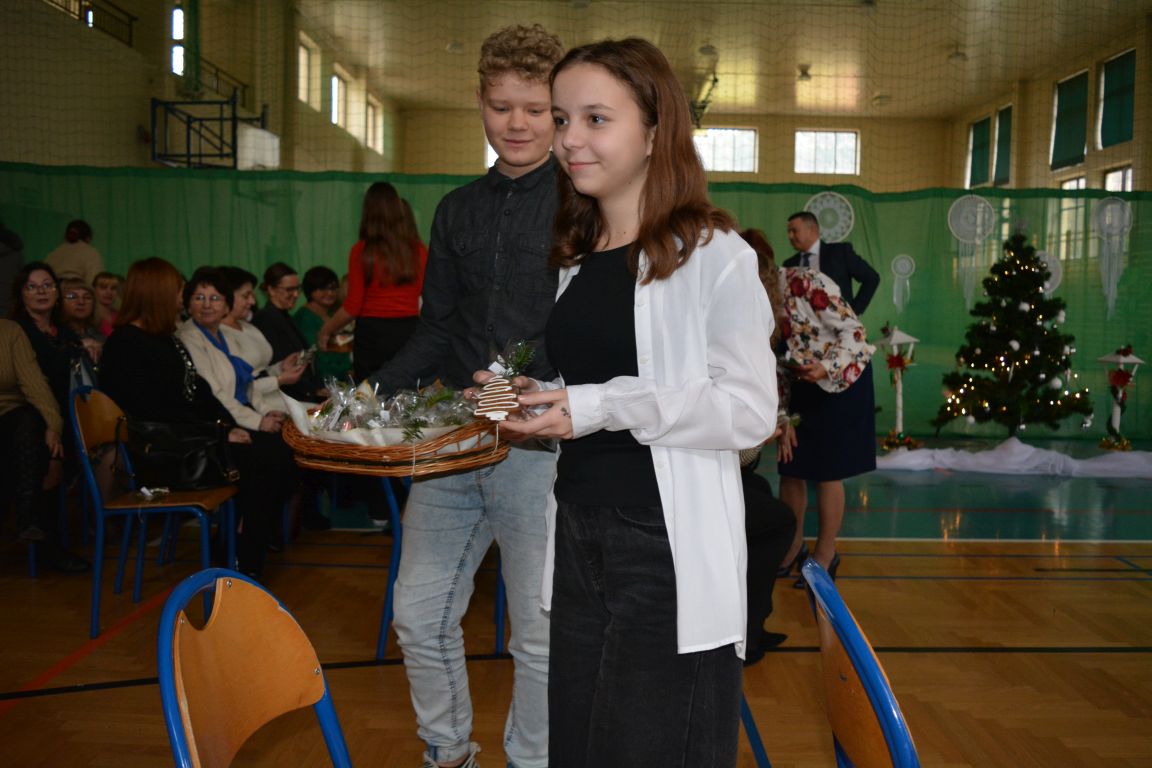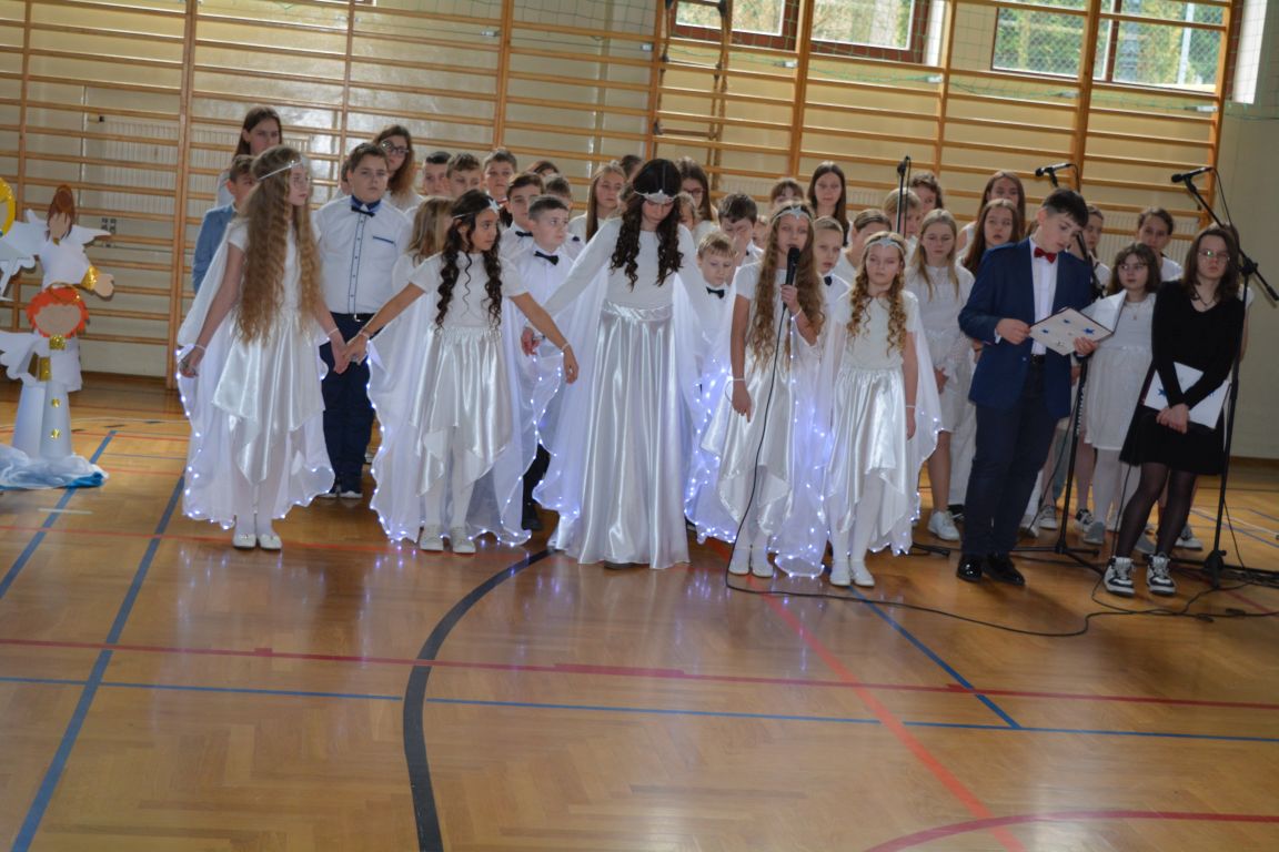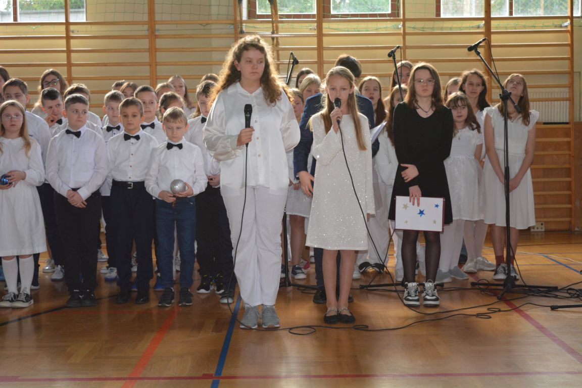 Czas Bożego Narodzenia to okres szczególny, czas magiczny. Obdarzamy się wzajemną życzliwością, łamiemy się opłatkiem, składamy życzenia. W tym czasie zapominamy o wszystkich sporach, a poddajemy się magii świąt, o czym w uroczystym, świątecznym  przedstawieniu  przypomnieli nam uczniowie klasy 4a i 6b oraz chór szkolny „Amadeus”. W  patorałkowych rytmach, w tańcu aniołów oraz w przekazanym słowie ukazali to, co w świętach jest najważniejsze. W uroczystości uczestniczyli rodzice, nauczyciele, emeryci, pracownicy administracyjni oraz zaproszeni goście w osobach pana Wójta Karola Górskiego, przewodniczącego Rady Gminy Bogdana Łukaszyka, skarbnika gminy pani Renaty Lisowicz oraz dyrektor CUO pani Anny Łukaszyk. Program artystyczny został przygotowany przez panią Dorotę Wierzchanowską oraz Monikę Pękalę. Dekoracje przygotowały: pani Lucyna Woch, Barbara Malisz oraz Sylwia Wrońska, a o oprawę muzyczną zadbał pan Mirosław Kawa. Przedstawienie dostarczyło wszystkim uczestnikom wielu wrażeń i wprowadziło w niezwykłą atmosferę świąt. Wszystkim uczniom, rodzicom, nauczycielom oraz pracownikom szkoły składamy najserdeczniejsze życzenia. Wesołych Świąt Bożego Narodzenia oraz szczęśliwego Nowego Roku 2025!