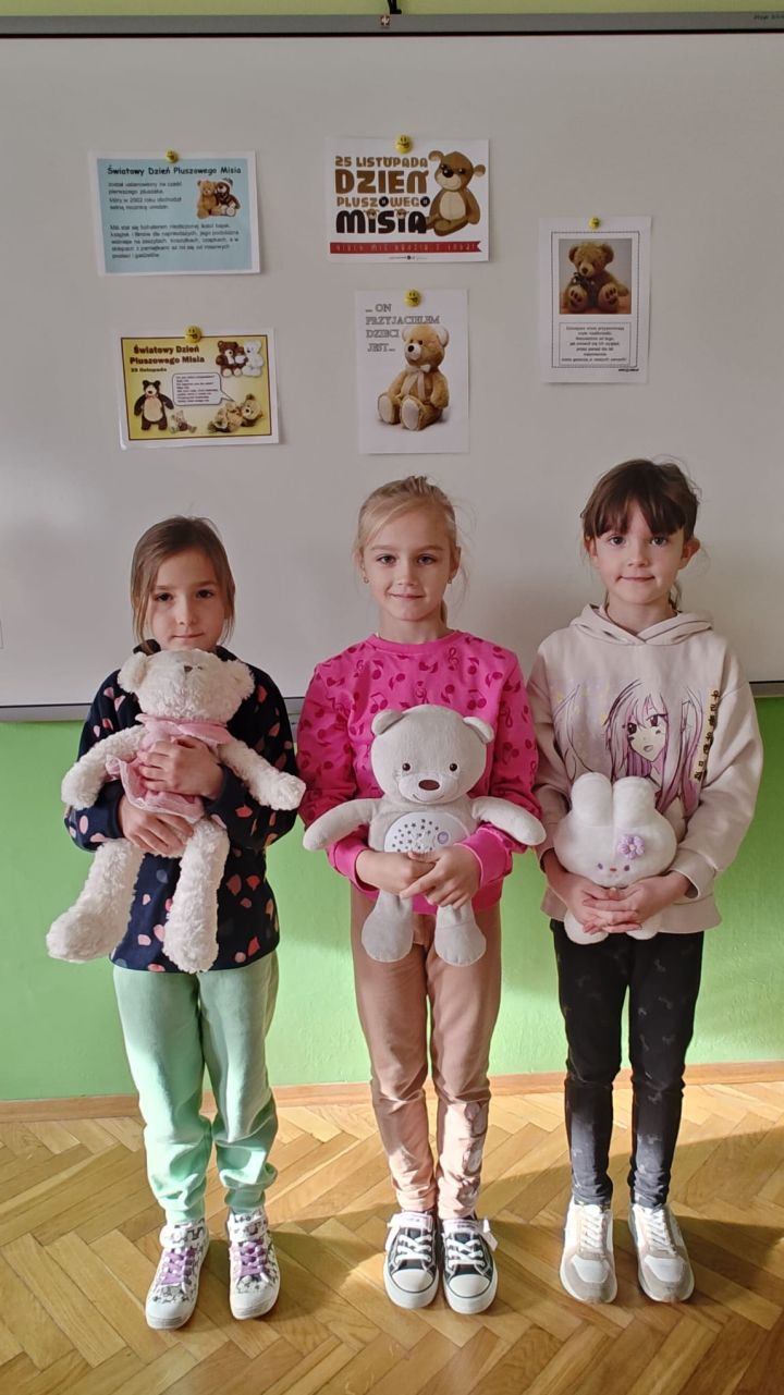 W poniedziałek 25 listopada świętowaliśmy Światowy Dzień Misia Pluszowego. W związku z tym w klasach I-III dzieci przyniosły do szkoły swoje ulubione misie, malowały figurki gipsowych misiów, wykonywały opaski z misiami i inne prace plastyczne. Na przerwach dzieci spacerowały z misiami oraz bawiły się w „Stary niedźwiedź mocno śpi”. Taki wesoły dzień na długo pozostanie w pamięci dzieci.