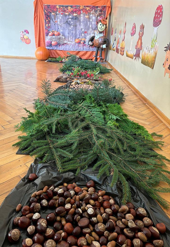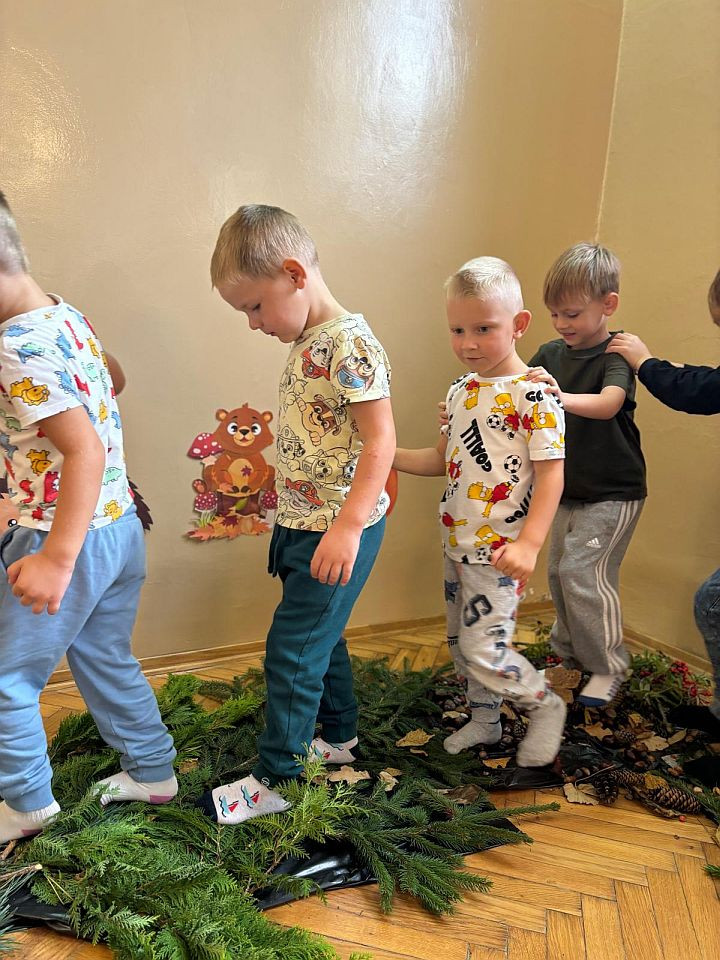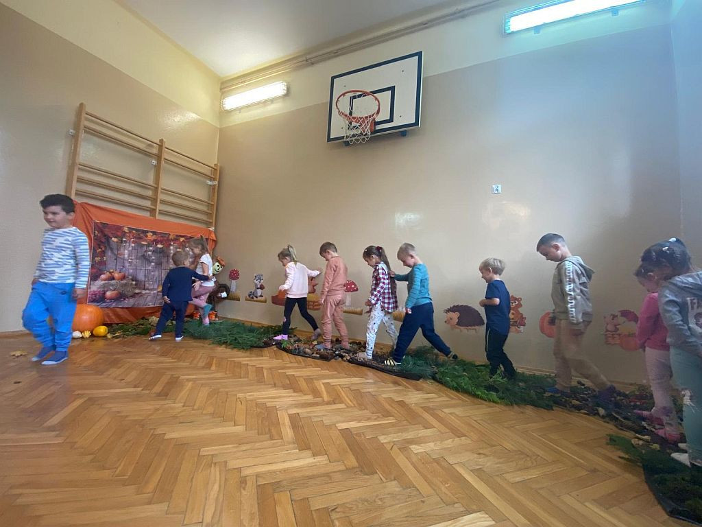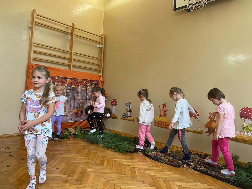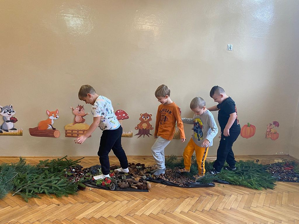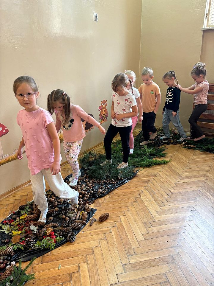 W dniu 2 października w naszym przedszkolu odbyły się zajęcia z wykorzystaniem ścieżki sensorycznej z materiałów przyrodniczych. Dzieci przechodziły po różnych fakturach: szyszkach, orzechach, żołędziach i miękkiego „dywaniku” z mchu, gałązek m.in. świerka, sosny, jarzębiny. Celem zajęć było stymulowanie zmysłów m.in. dotyku, węchu, słuchu. Zabawa dała dzieciom wiele radości i nowych doświadczeń.